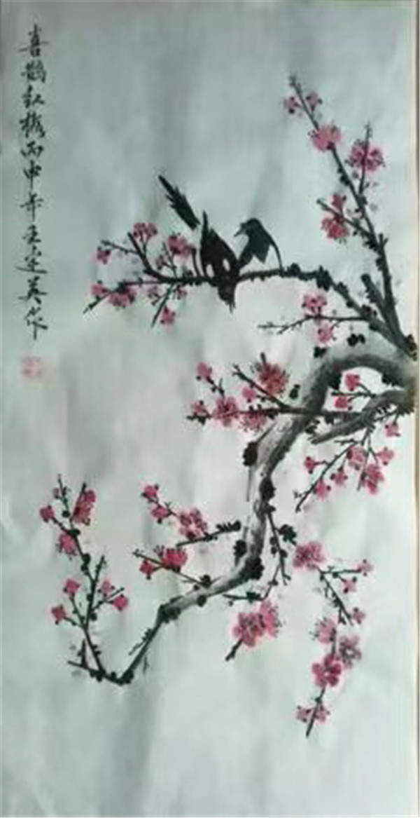 而花鸟系列则尽显其细腻情思:墨竹的挺拔有君子之风,牡丹的雍容含吉祥之愿,寒梅上的喜鹊啼鸣着春日的期盼,菊瓣间的游蝶舞动着清秋的意趣。她笔下的草木禽鸟并非自然的复刻,而是心象的投射,一枝一叶皆含情,一禽一鸟皆有意,在写意的笔墨中传递着对生命的温柔体察。
