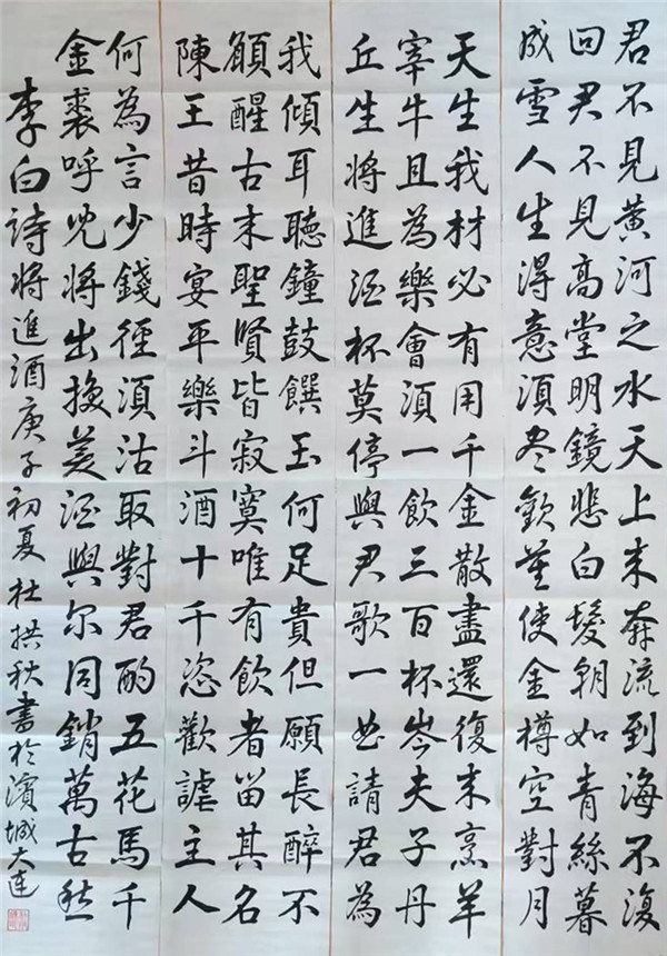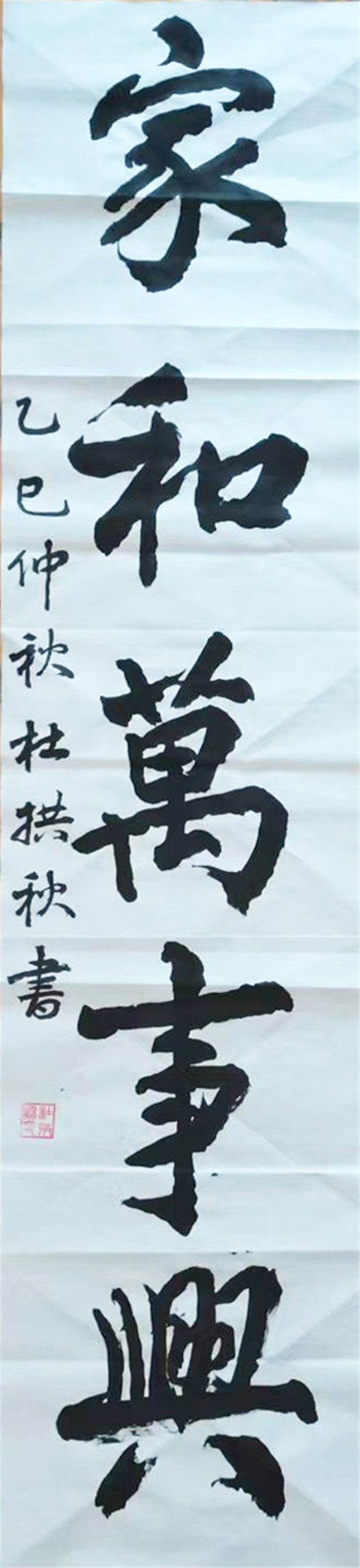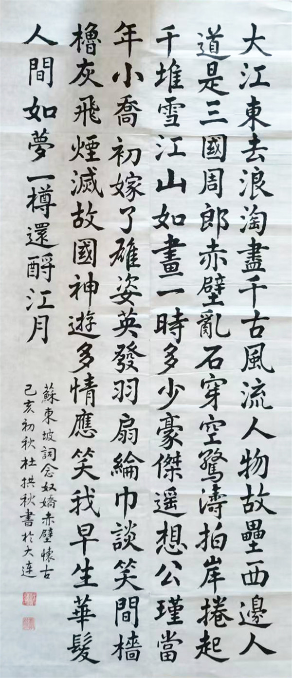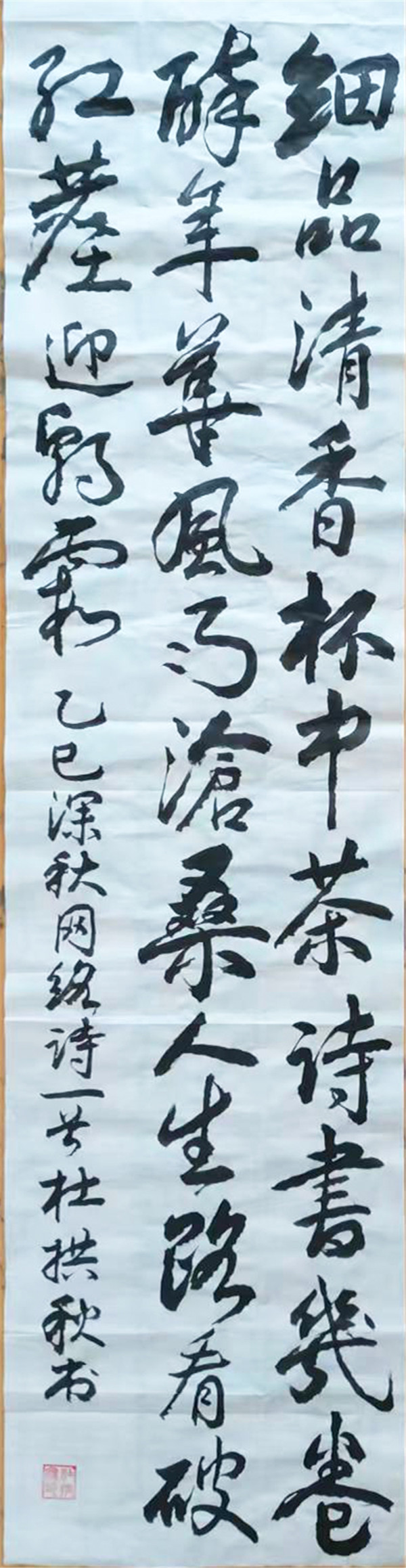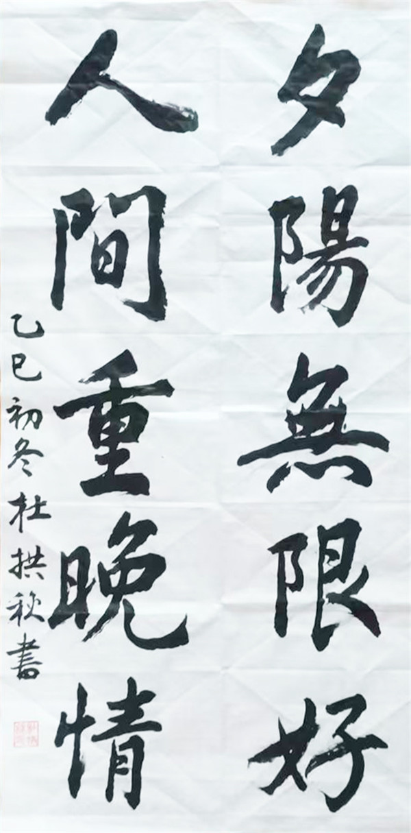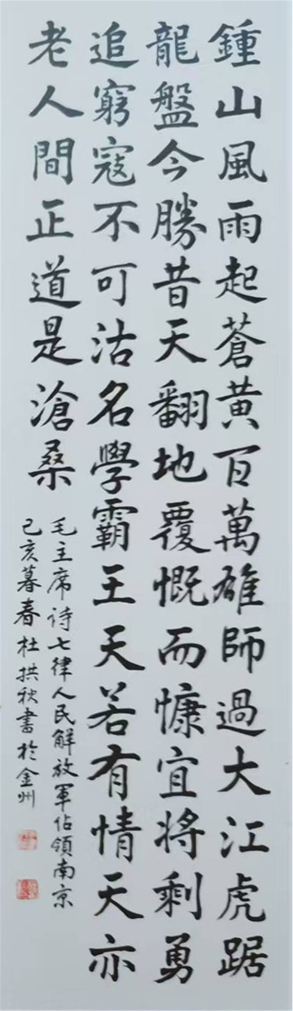 杜拱秋,1932 年生,浙江东阳人。1954 年毕业于上海交通大学,长期在国营企业从事科技工作,研究员级高级工程师。参加全国各级书画展赛活动,获奖 50 余次,一等奖、金奖 17 次。作品入编各类获奖作品集。2005 年加入中国书画研究院任研究员。现为金普新区老年书画研究会会员、大连市老年书画研究会会员。2025年下半年在网上参加书法比赛,获特等奖5次,金奖1次,一等奖3次。2024年在中国书画导報出版中心,出版个人书法作品集一本。