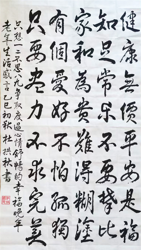 “书者,散也。欲书先散怀抱,任情恣性,然后书之。” 东汉蔡邕《笔论》所言之境,恰是杜拱秋先生书法创作的生动注脚。先生出身工科,却以笔墨为寄,在尺素间耕织数十载,将科技工作者的严谨与文人的浪漫熔于一炉,终成独树一帜的书风。