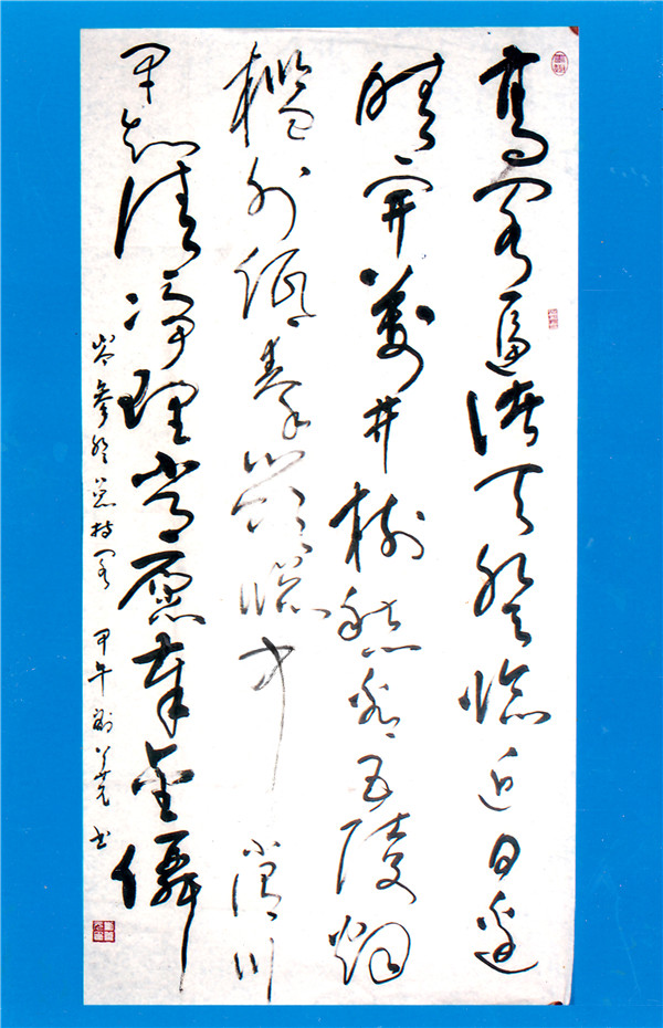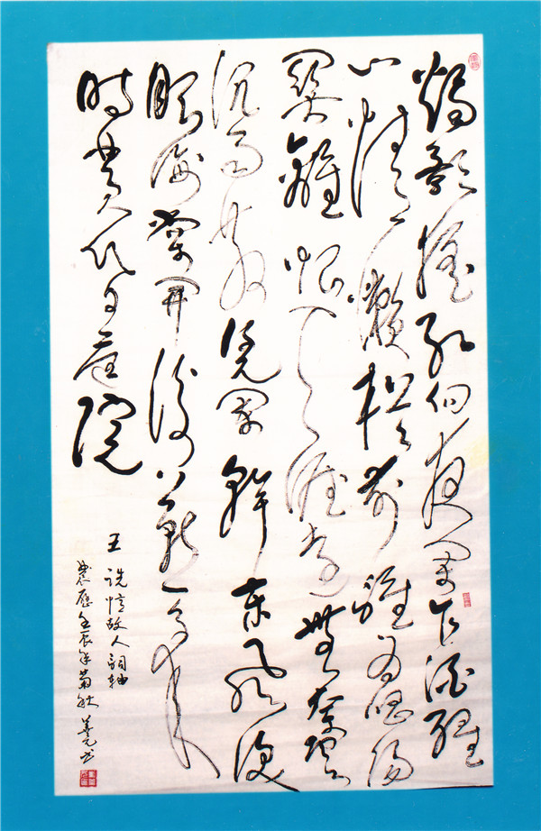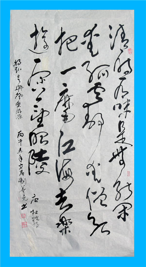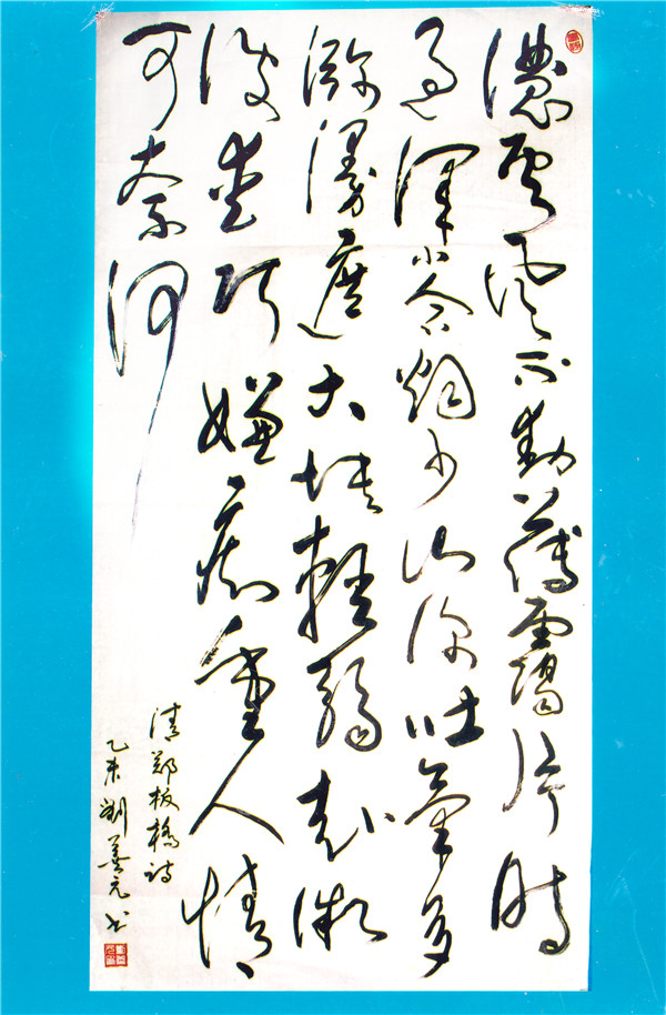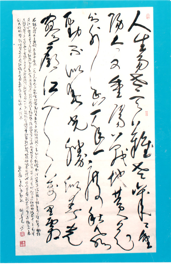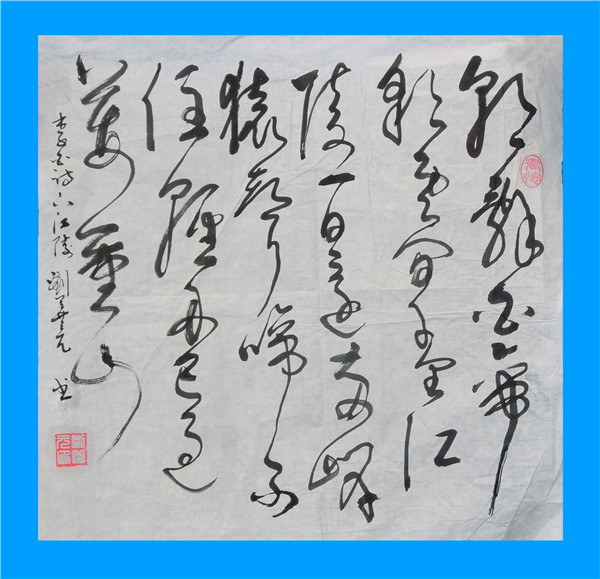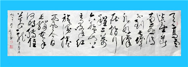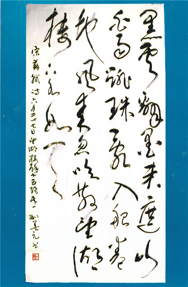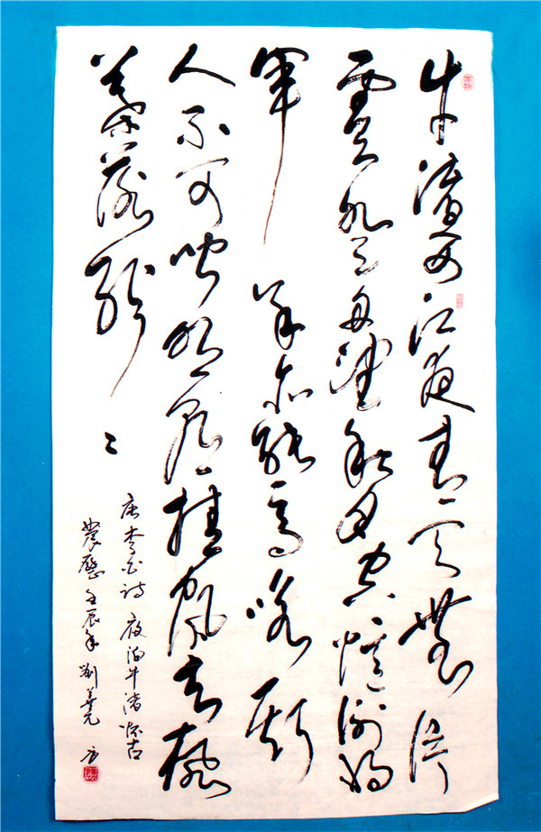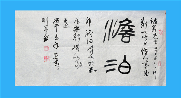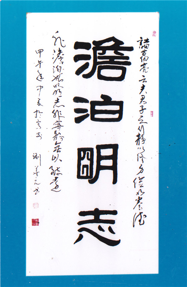 他的隶书取法《张迁碑》《石门颂》,朴茂厚重间见奇逸之姿,正如清代刘熙载所言 “隶形与篆,隶意与草”,将篆之圆融、草之灵动注入方整汉隶,凝练出 “澹泊明志” 这类作品的沉雄气象。狂草则追怀张旭、怀素,笔走龙蛇而不失法度,线条如 “奔雷坠石,鸿飞兽骇”(萧衍《古今书人优劣评》),在《早发白帝城》《念奴娇-赤壁怀古》等作品中,以墨色浓淡、线条疾缓重构古典诗词的情绪节奏,使文字的韵律与书法的张力浑然一体。