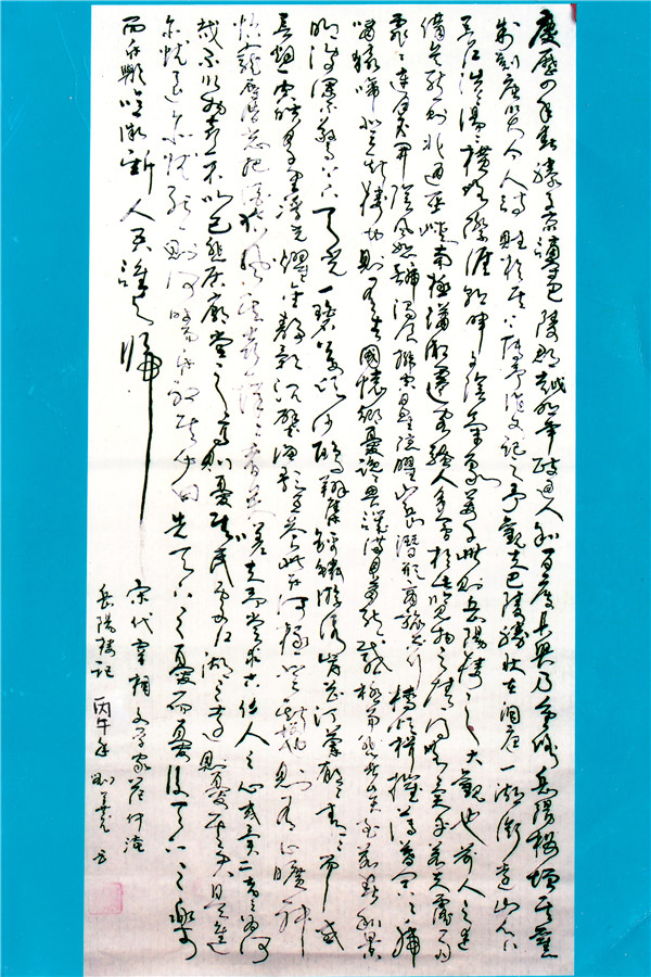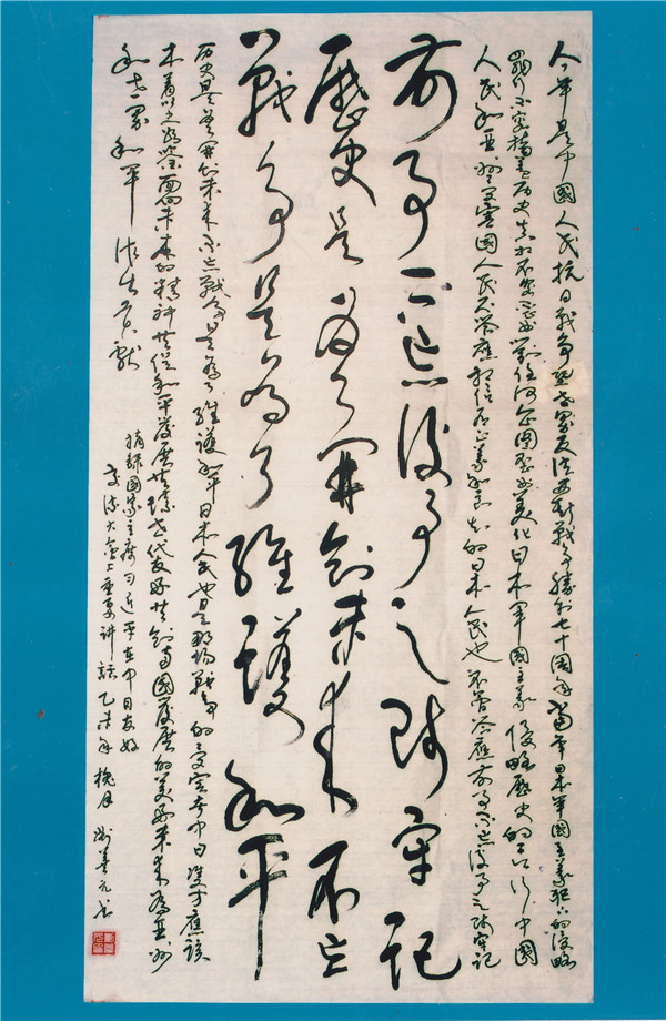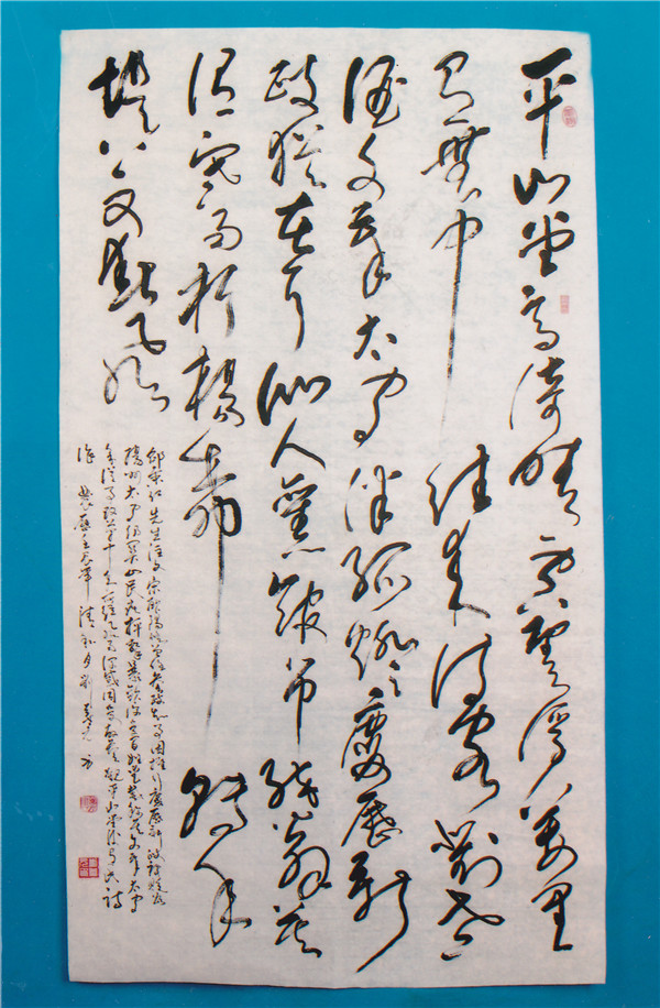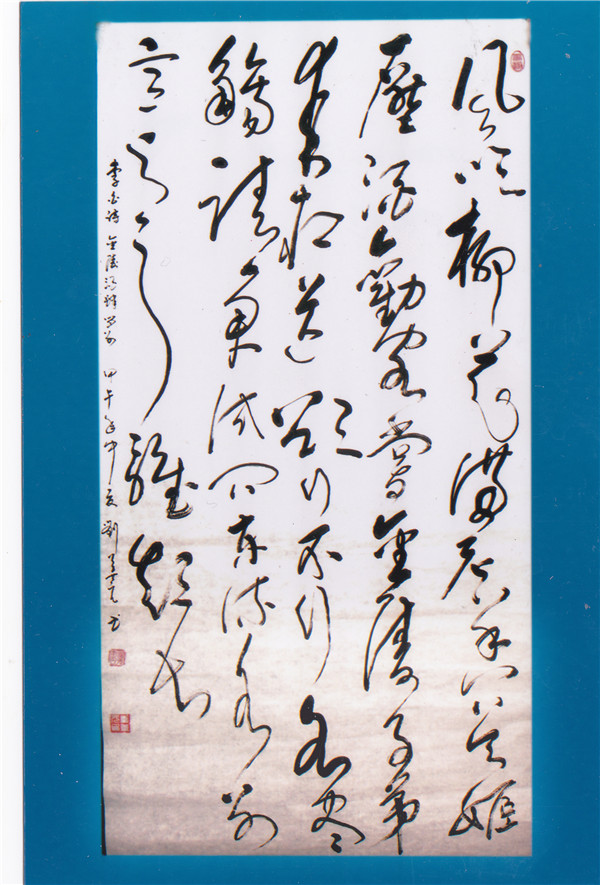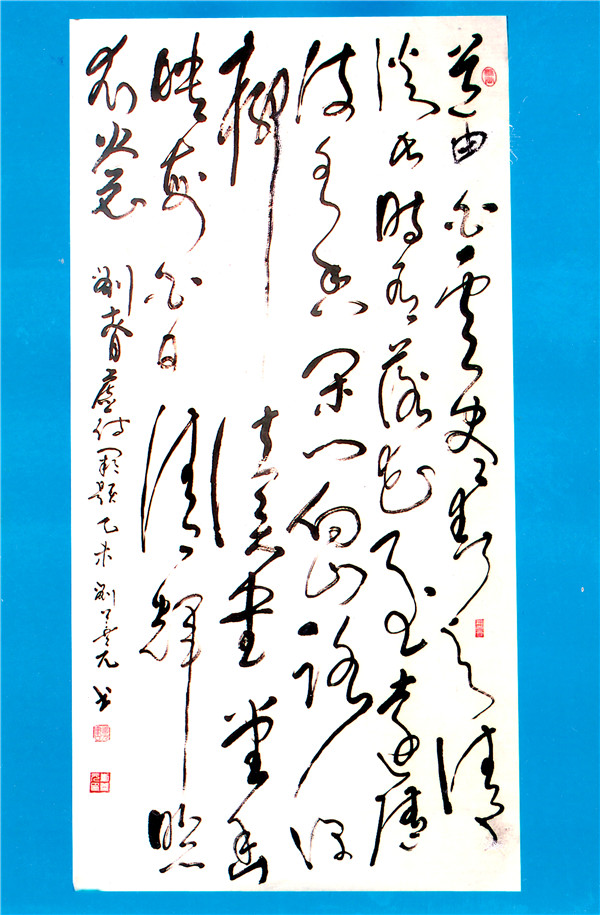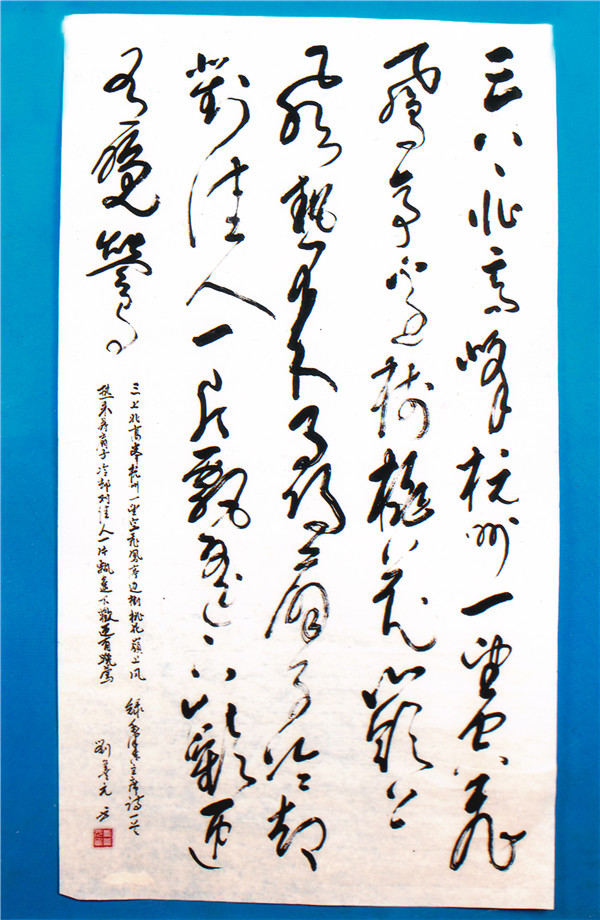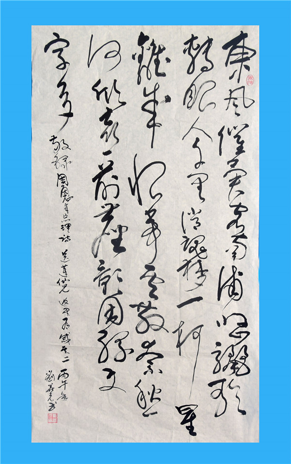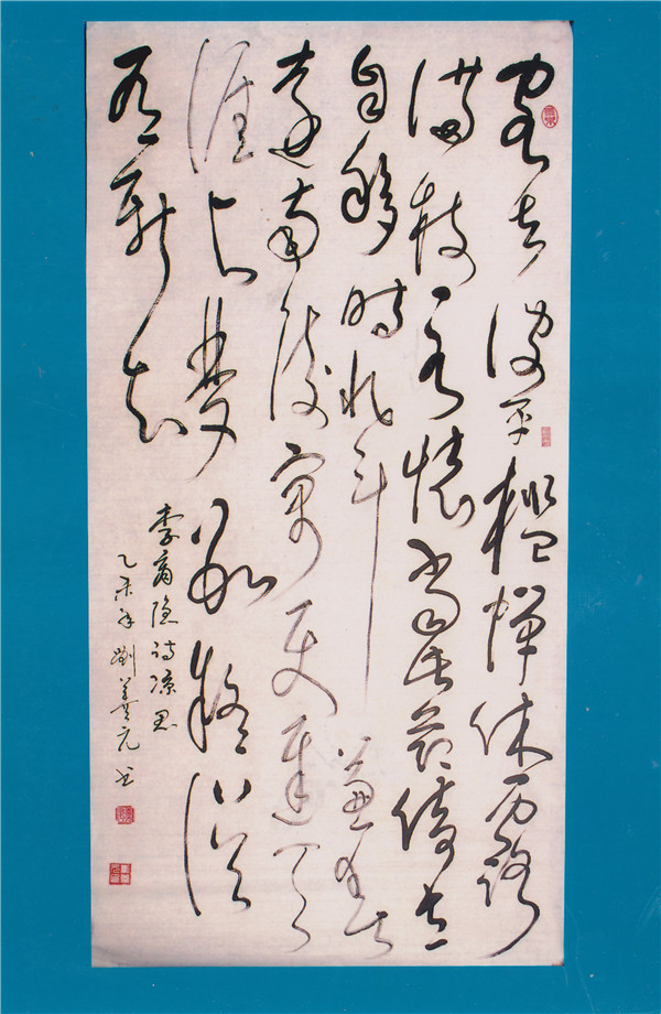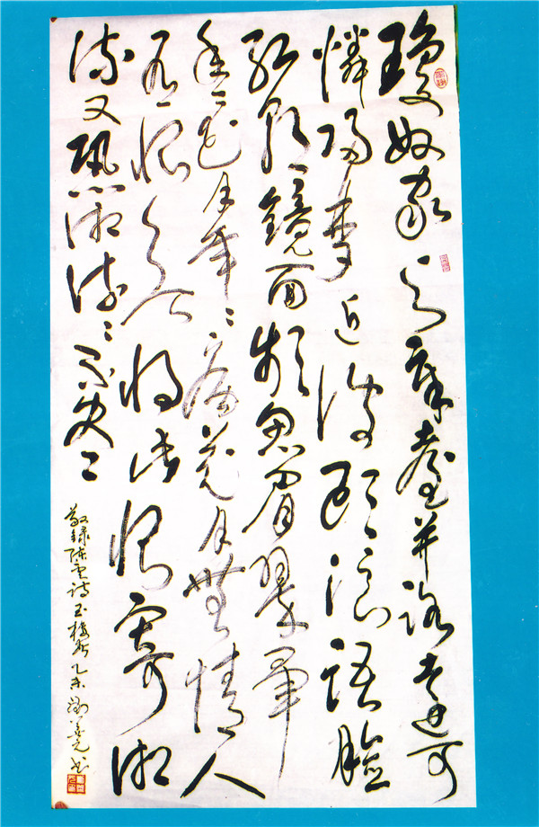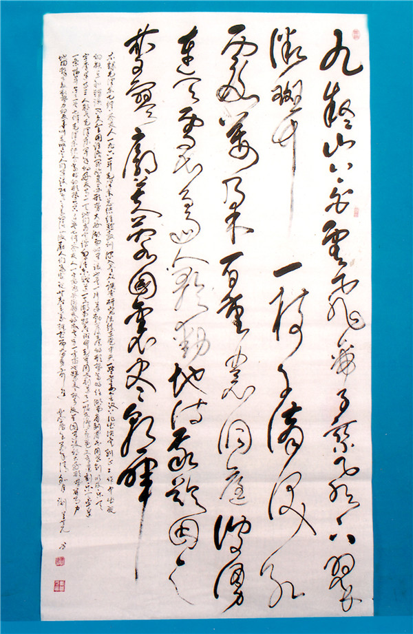 他的隶书取法《张迁碑》《石门颂》,朴茂厚重间见奇逸之姿,正如清代刘熙载所言 “隶形与篆,隶意与草”,将篆之圆融、草之灵动注入方整汉隶,凝练出 “澹泊明志” 这类作品的沉雄气象。狂草则追怀张旭、怀素,笔走龙蛇而不失法度,线条如 “奔雷坠石,鸿飞兽骇”(萧衍《古今书人优劣评》),在《早发白帝城》《念奴娇-赤壁怀古》等作品中,以墨色浓淡、线条疾缓重构古典诗词的情绪节奏,使文字的韵律与书法的张力浑然一体。