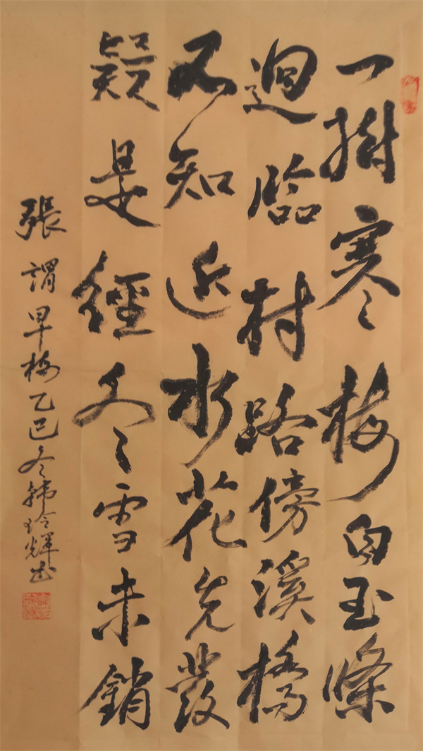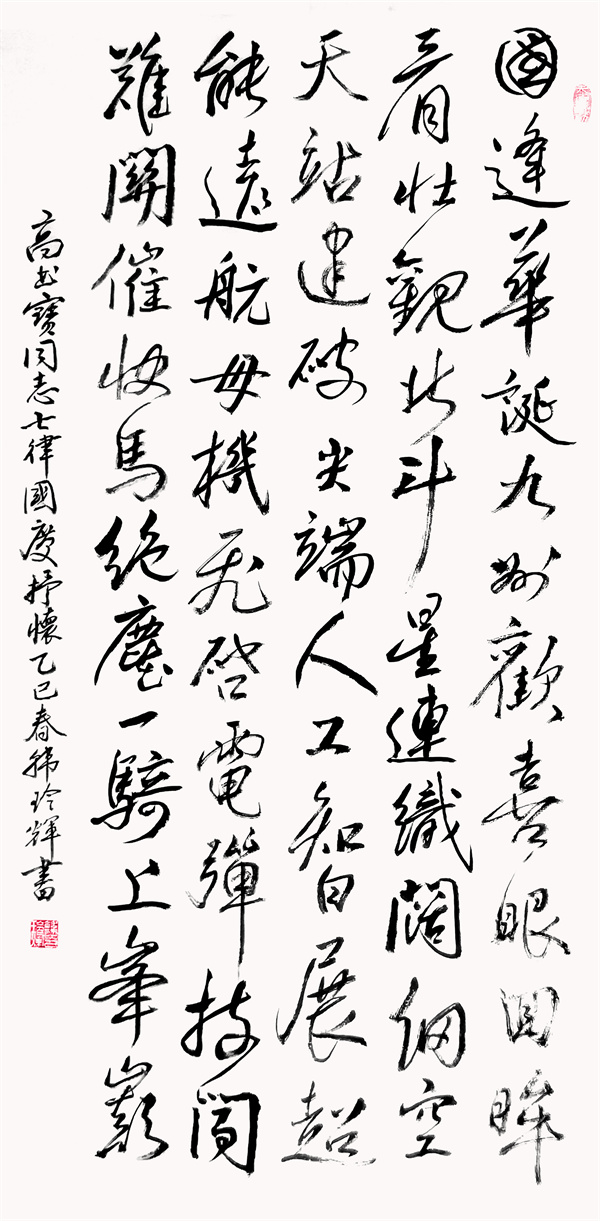 先生对古典诗词的书写,既恪守传统笔法,又赋予笔墨当代审美意趣,其行草作品中 “迟速相济、虚实相生” 的节奏,深得孙过庭《书谱》“五合交臻” 之妙。