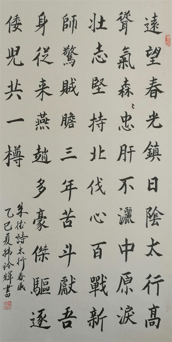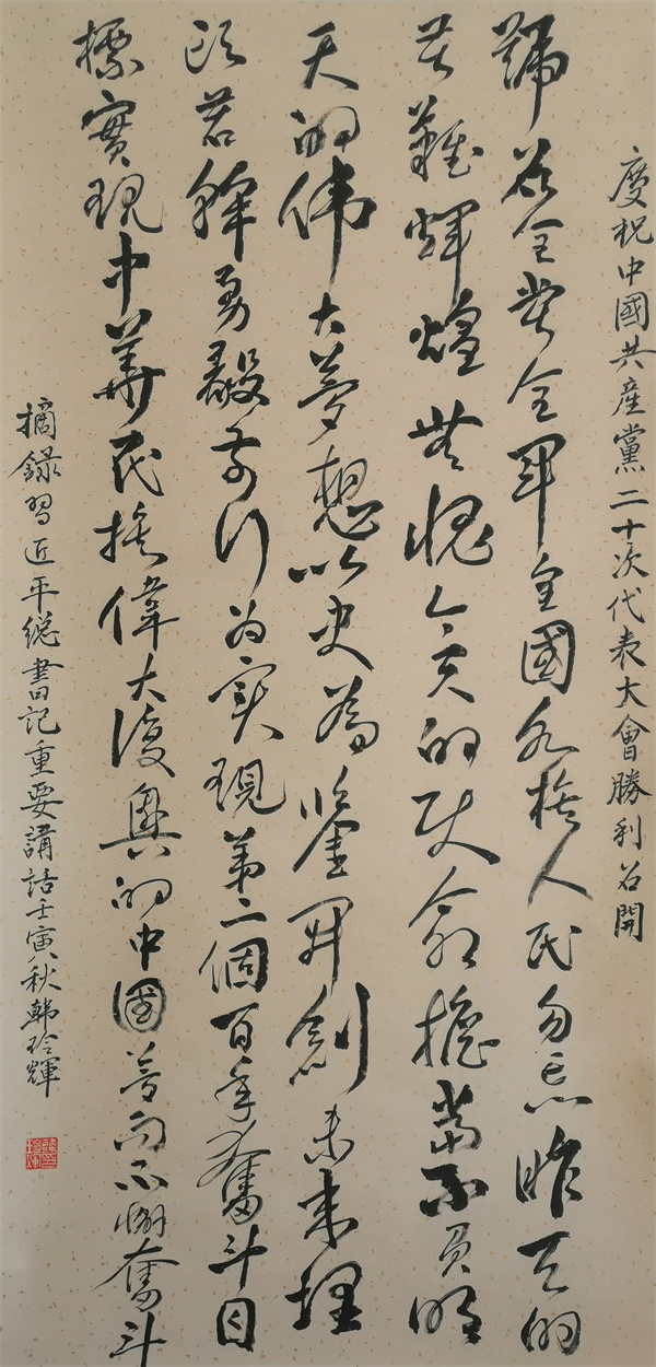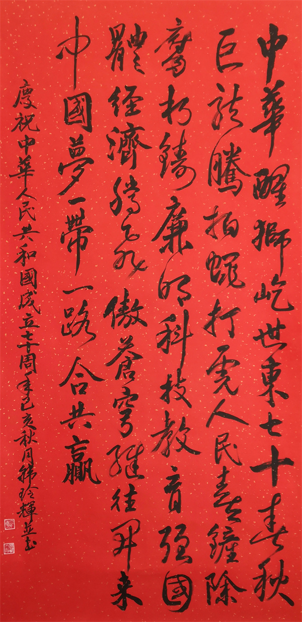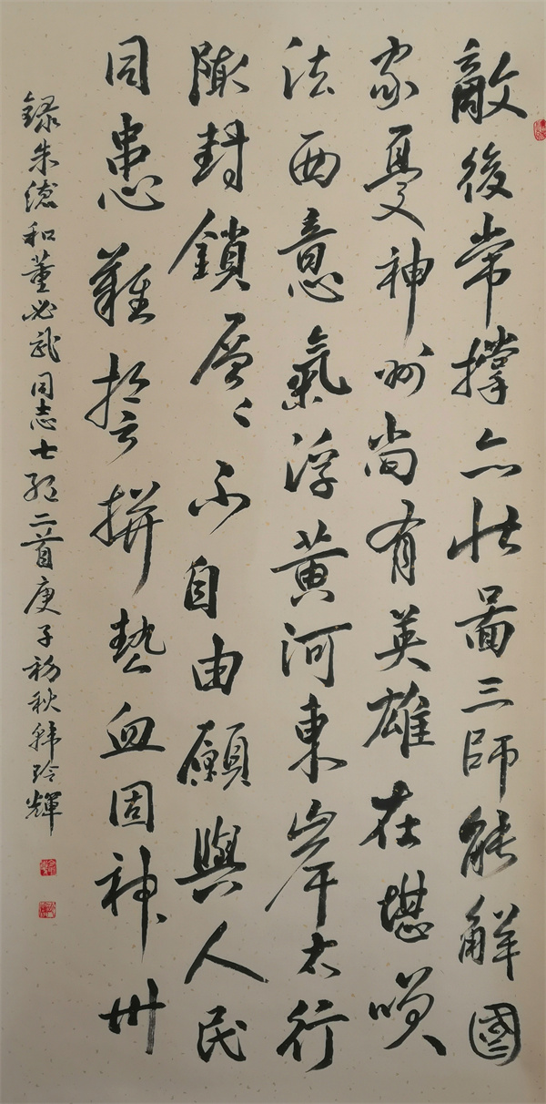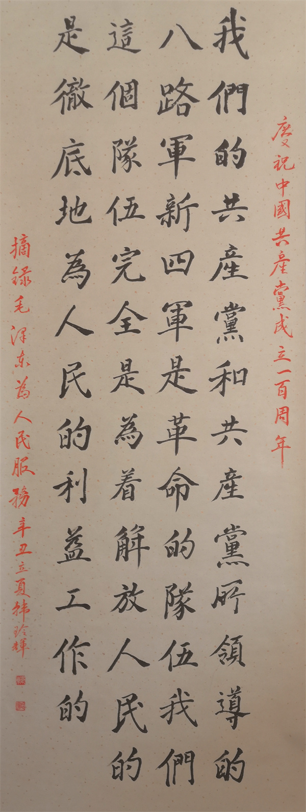 韩玲辉先生的书法,兼具北碑的雄强与南帖的流美,尤其在红色主题作品中,将家国情怀融入笔墨章法,是当代书坛 “以书弘道” 的有益尝试。