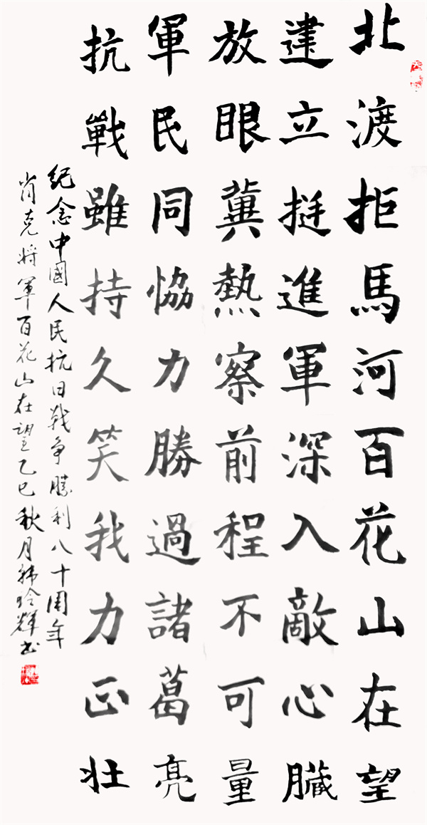 本次网络展所呈现的作品,涵盖红色主题、古典诗词与当代论述:《沁园春-雪》笔走龙蛇,尽显伟人词章的磅礴气象;《早梅》《山行》以行草写唐人诗意,墨色浓淡间漾起清雅文心;而纪念抗战、礼赞新时代的作品,则以方正楷法与奔放草书,将家国大义凝注于笔端。