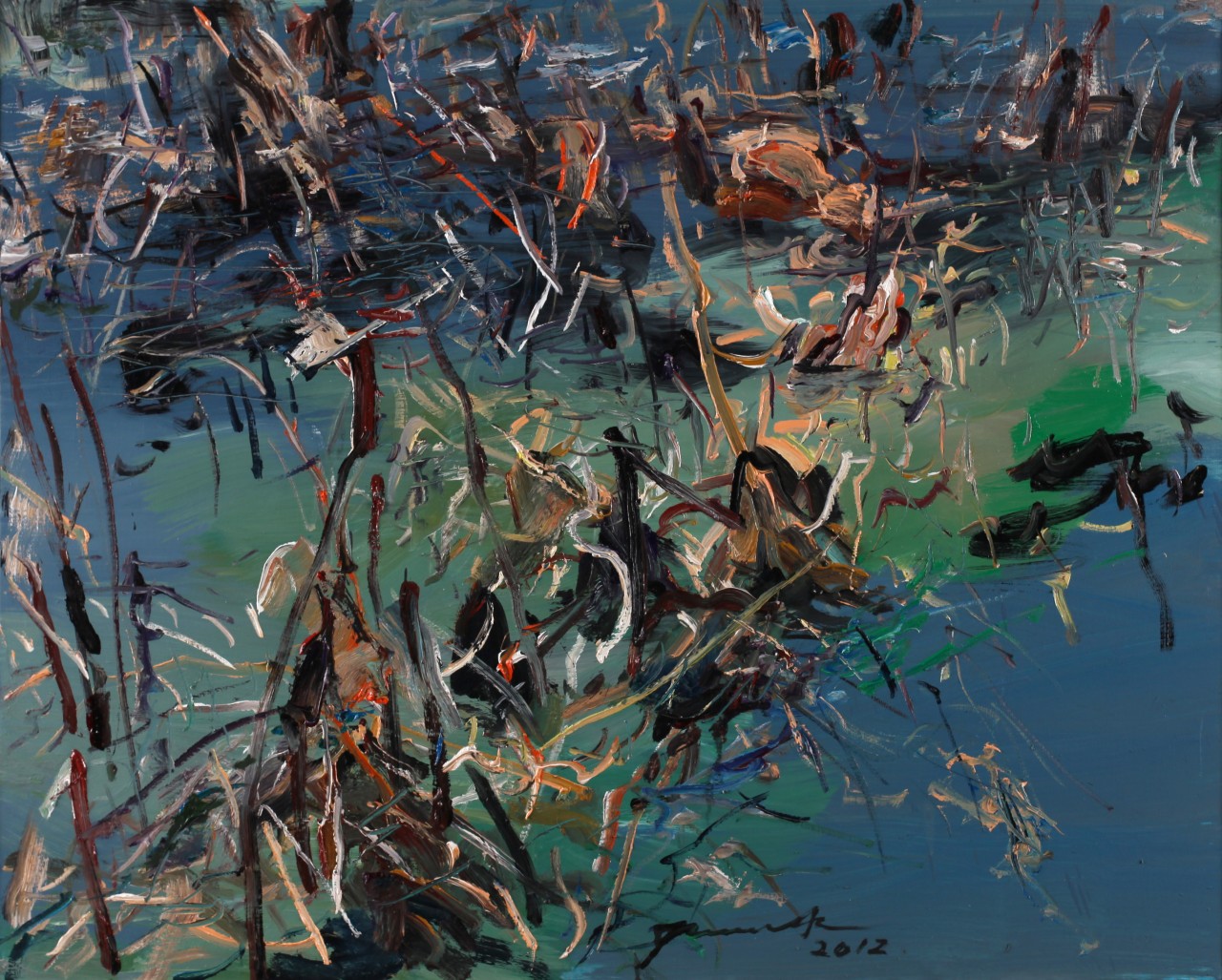 现在,他引爆了自身所经历的岁月,在线条中咆哮...用颜色鞭打...试图网罗从身体内部和血液、自然和生命本能的生硬。一扫,一刷,林正在游说画布并使画布响应回复。他不是在强调线条,而是在寻找它,压制它,开启它发现自己,多年后实现所有法则以及“美育”的规则。