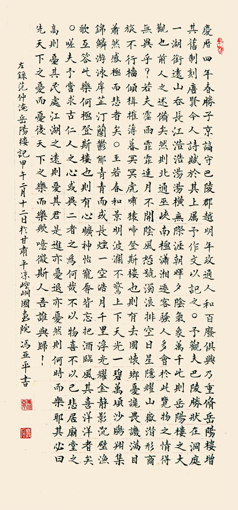 冯亚平,男,书名岩石、陇原牛夫。1950年生于甘肃庆阳正宁县人,一生酷爱书法主攻楷书,唐四大家入手,后一直以习欧阳询、柳公权、兼习王羲之,魏碑。通过多年的孜孜以求终获率更神髓,基书法既有欧的劲刻历,又有二王德温润、又有魏碑的法度、刚健、厚重。多年研修、努力学习参加中国书法家协会西部教育基地两次高研班,取得结业。毕业证书作品入选第三届、第四届全国书画频道迎新春书法作品展。参与全国老年书法大赛,荣获第四届全国老年书法优秀奖。